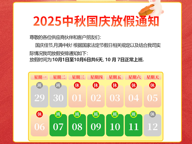 尊敬的各位供應(yīng)商伙伴和客戶朋友們:國慶佳節(jié),月滿中秋!國慶家園月圓人團(tuán)園,國慶中秋雙節(jié)共歡騰!在此預(yù)祝大家度過一個輕松、愉快的假期.根據(jù)國家法定節(jié)假日相關(guān)規(guī)定,再結(jié)合我司實際情況,現(xiàn)將2025年國慶中秋節(jié)放假安排通知如下:放假時間定為10月1日至10月6日(星期三至星期一),共計6天.2025年 10月 7日(星期二)正式上班,假日期間如有業(yè)務(wù)需求可電話咨詢業(yè)務(wù),感謝大家的理解與配合!秋高氣爽迎中